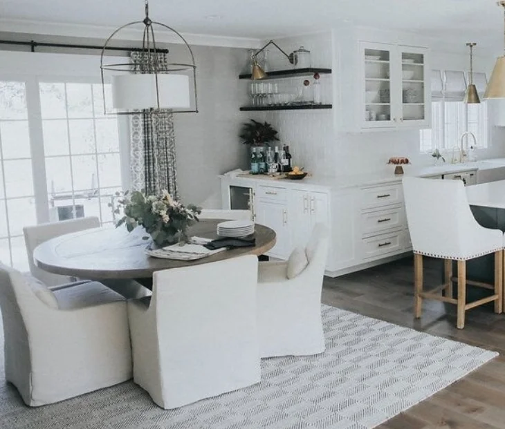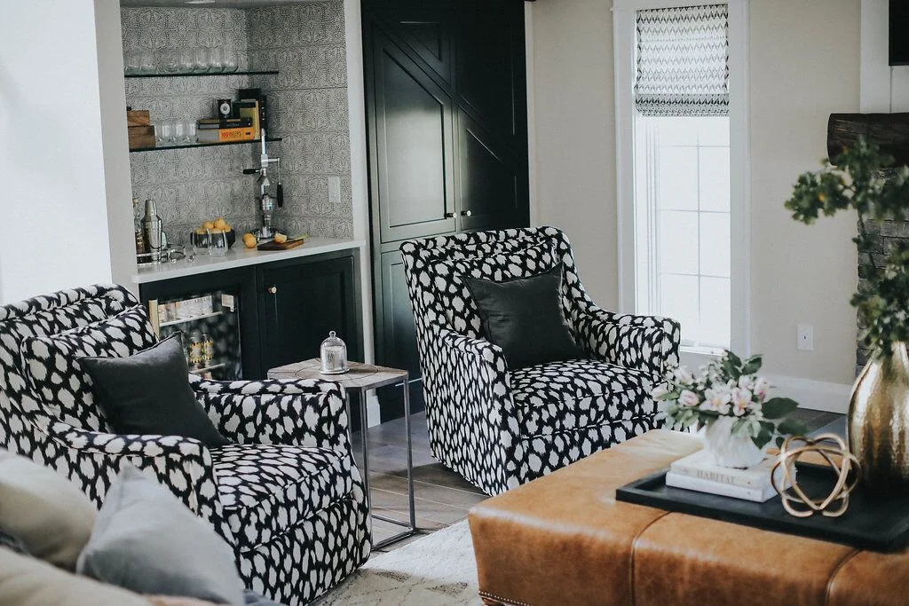 And don't forget to make your home bar beautiful! Add a gorgeous, eye-catching wall covering or antiqued mirror behind the open shelving so the whole shebang adds some eye appeal to the room.