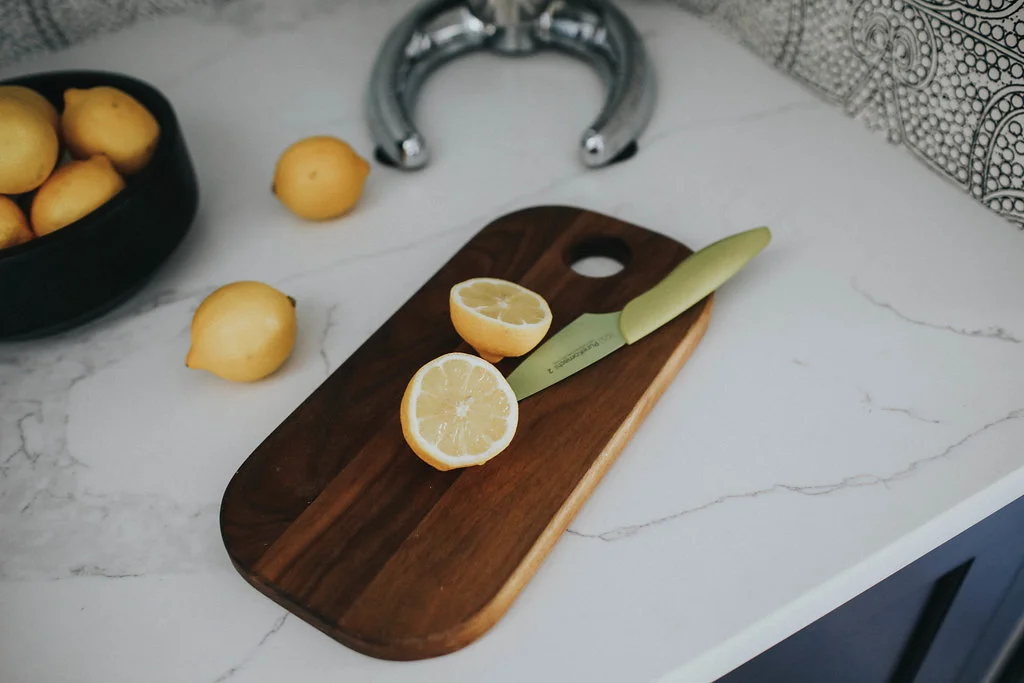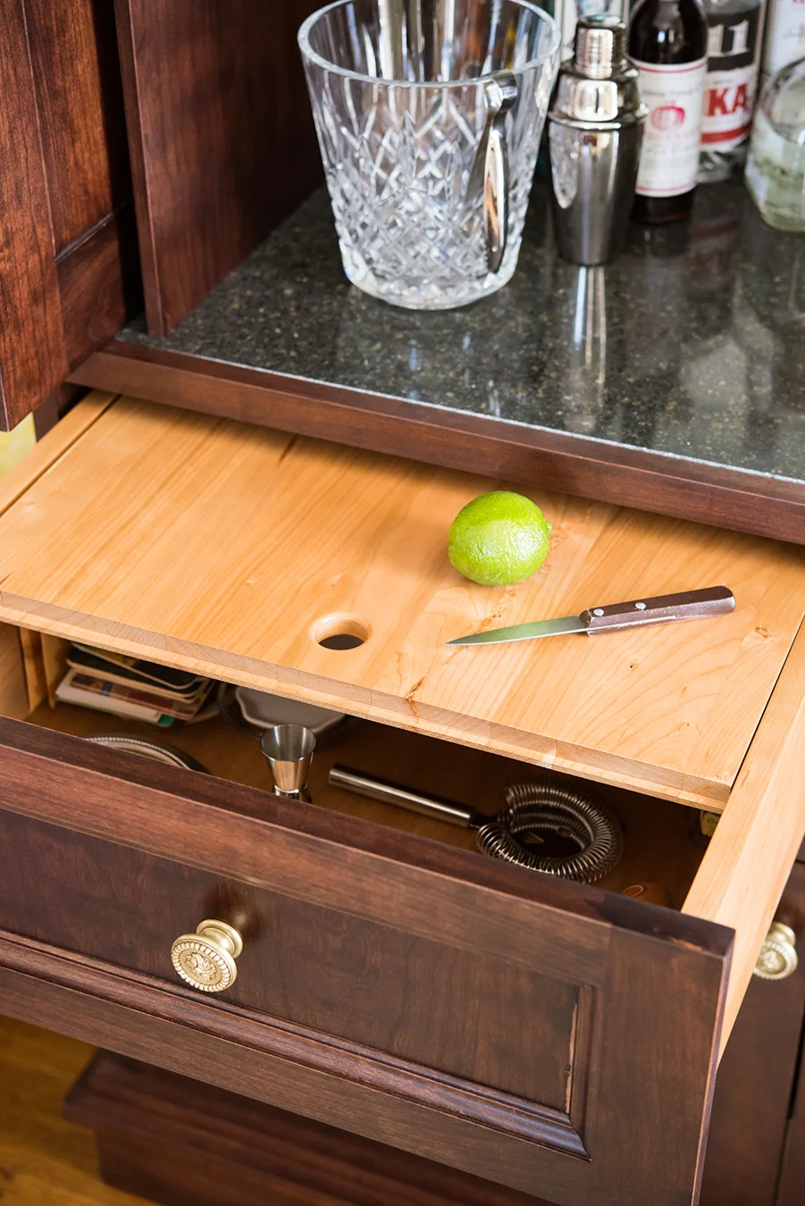 And if you're lacking a counter, you can create one by putting a cutting board right on top of an open drawer. We built one into the barmoire's drawer just for that purpose.