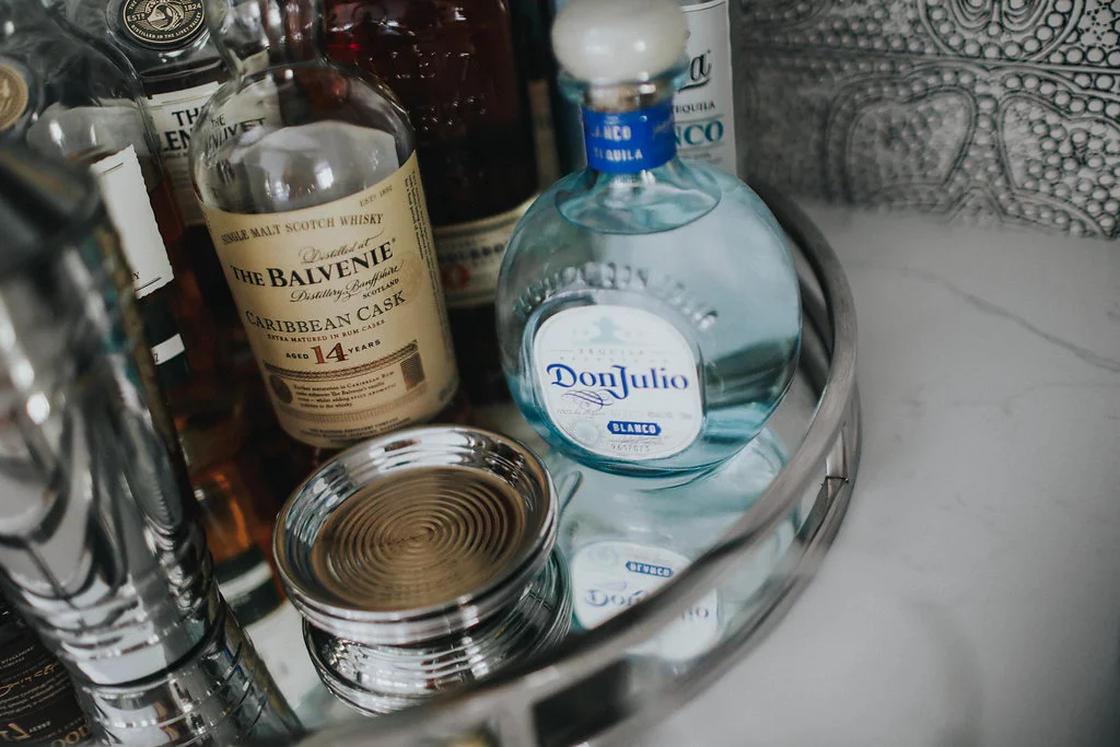 Pretty trays and glasses, as well as live plants, cut flowers, or bowls of fruit are great for dressing up your bar up to suit the room.
